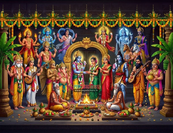 - An exquisitely crafted 4K ultra-high-resolution digital artwork of Srinivasa Kalyanam, portraying the divine celestial wedding of Lord Venkateshwara and Goddess Padmavathi with refined elegance, intricate ornamentation, and rich, harmonious color tones.